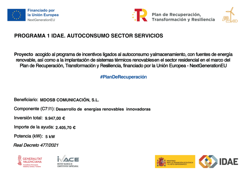 Proyecto acogido al programa de incentivos ligados al autoconsumo y almacenamiento, con fuentes de energía renovable, así como a la implantación de sistemas térmicos renovables en el sector residencial en el marco del Plan de Recuperación, Transformación y Resiliencia, financiado por la Unión Europea – NextGenerationEU